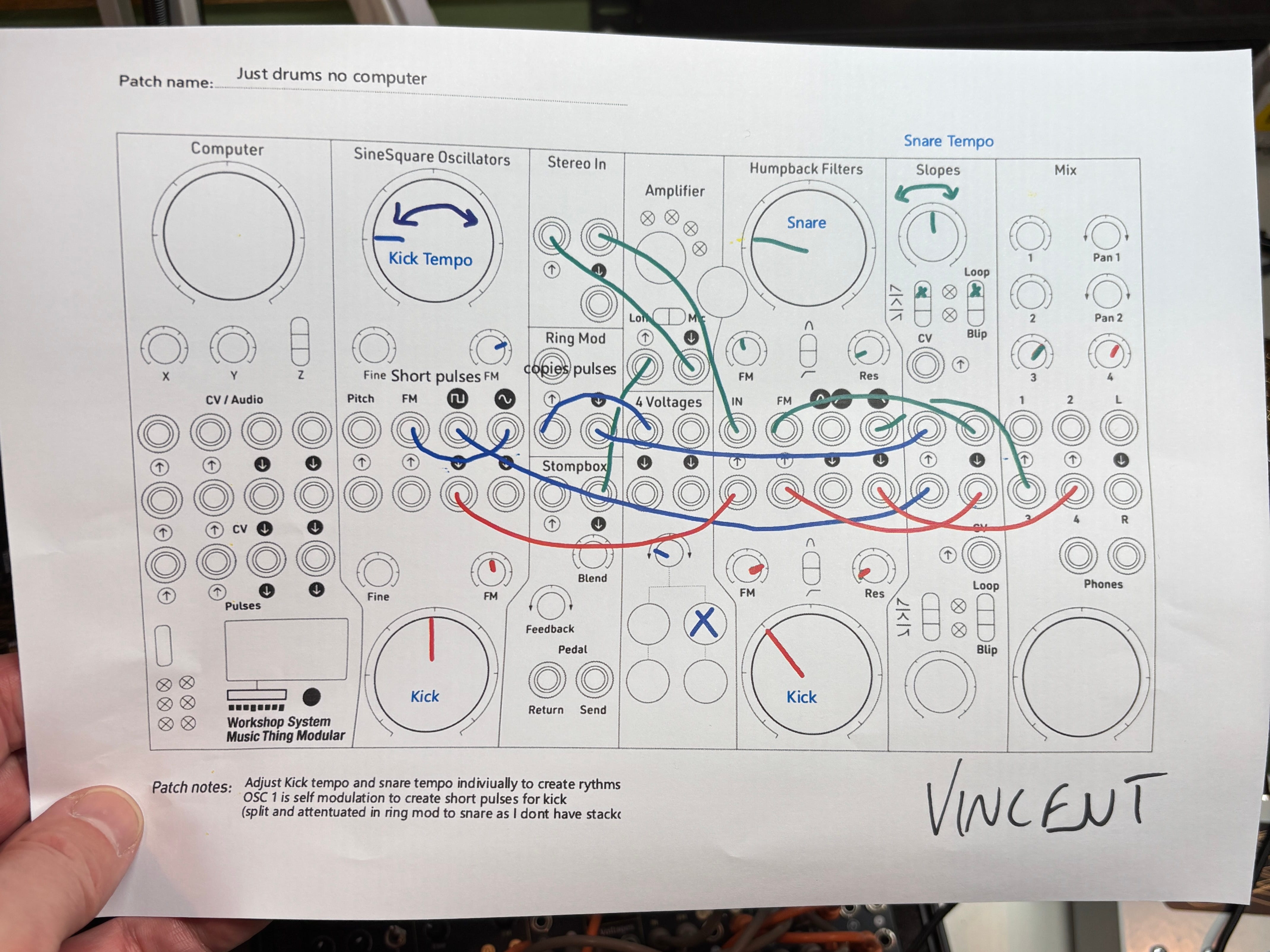 This is a simply brilliant analogue patch from Vincent (again!) on the discord, turning the system into a chaotic, self-playing, great-sounding, extremely tweakable kick/snare drum machine. He chains three modules (Stompbox, Amplifier and Stereo In) to create enough white noise for the snare drum, triggered by some 🤯 clock divider business using the Ring Mod and a slope. It slips between doof doof doof and weirdness very pleasingly. I made a quick demo video.