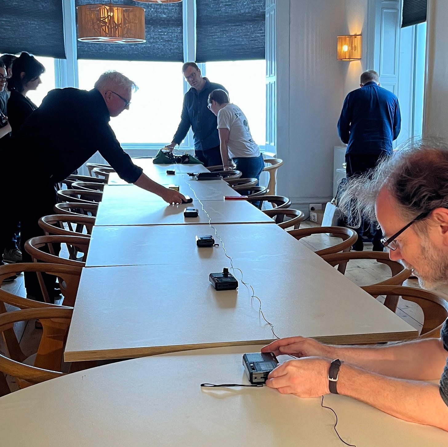I took some lightly modified Workshop Systems to the Dyski Radio Music residency in Cornwall last month, set up with Chris Johnson’s AM Coupler program card and a cheap wire antenna. The system broadcasts medium wave radio pretty well across a room. You can broadcast weird jingles or sounds from the system, and sweep the broadcast frequency to move sounds to handheld radios around the room, which is what I’m doing in the picture above.