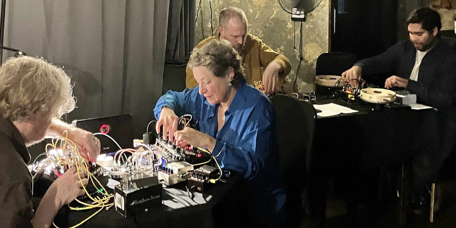 I was grinning all the way through Sound Bureau in a basement vinyl bar in Streatham, South London a couple of weeks ago. Four very experienced improvisers using Workshop Systems in duos and a quartet. They all used clusters of devices around their systems — Tansy played the contact mic with nylon cord and a bow, Phil had a little noisebox, Jon used three handmade pedals. They played quietly through individual speakers, so it felt like an acoustic set, like chamber music. Half the joy was watching the musicians listening, communicating, thinking. Thank you all. Sound Bureau is back on 9th December, without Workshop Systems, but with tap dancing.